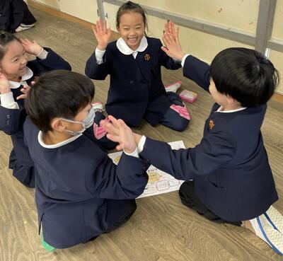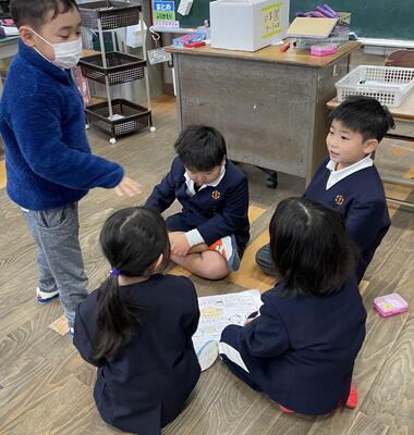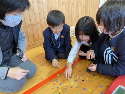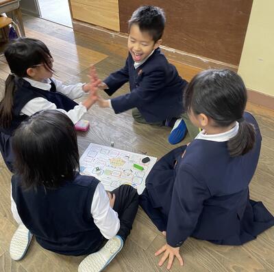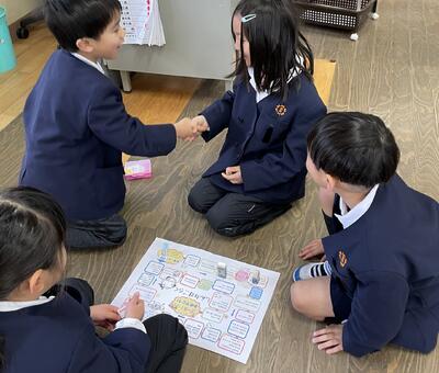 席替えの後、新しい班の友達と「新年すごろく」をしました。