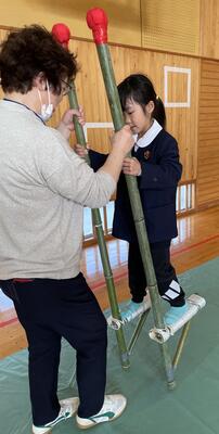 竹馬乗りでは、サポーターの方に支えてもらって、だんだん上手に乗れるようになっていました。