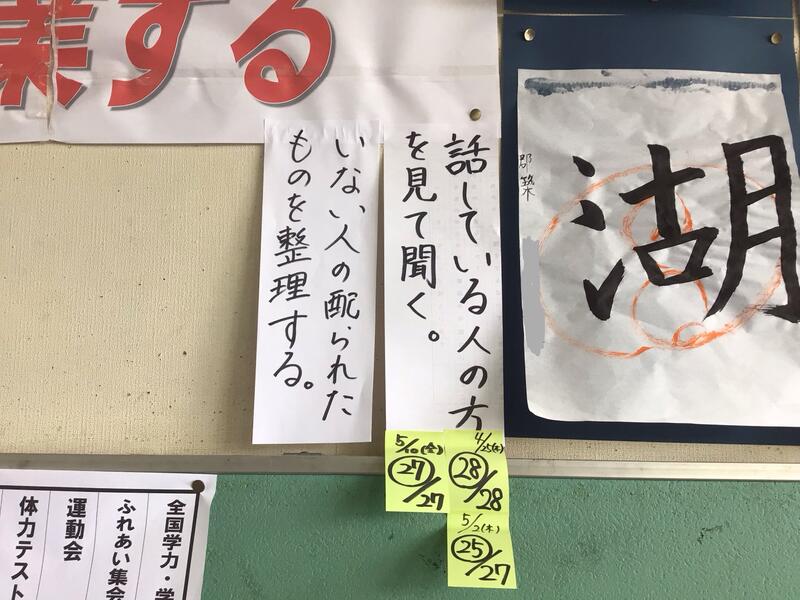 今年度も学級スローガンを達成するための具体的な目標(行動目標)を設定して、日々意識しながら生活しています。1つ目は、「話している人の方を見て聞く」でした。先週の振り返りで3週連続達成させることができたので、13日(月)に2つ目の目標を決めました。「いない人の配られたものを整理する」です。教室にいない子どもの配付物をそのままにしておくのではなく、一人一人が周囲を見て気付き、進んで引き出しに入れて整理することで、周囲に気を配る心、思いやる心を育てることができると考えます。そして、様々なところに気を配り、動くことができる力を育ててほしいと思います。とてもいい目標だと思います。