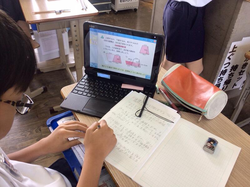 下の写真は、タブレットPCを使って式にあった面積の求め方を考え、説明する学習です。難易度が高めでしたが、互いに教え合って、学ぶことができました。