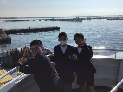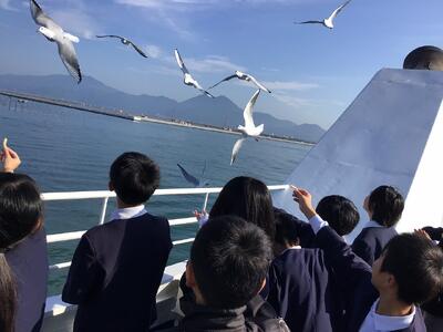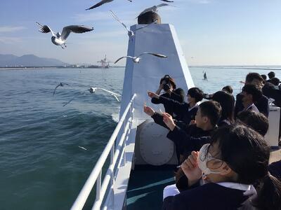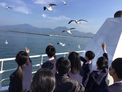 修学旅行の一行は、熊本港からオーシャンアローに乗り込みました。カモメにえさをあげて楽しそうです。みんな元気です。