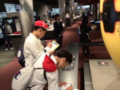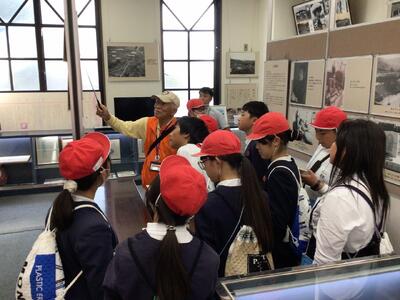 修学旅行の一行は、平和祈念公園で平和集会を行い、自分たちで心を込めて折った千羽鶴を奉納しました。また、語り部の方のお話を聞いて、戦争の怖さや悲惨さを改めて学びました。みんな真剣です。