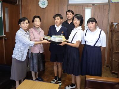 児童を代表して、図書委員会の委員長及び副委員長が受け取り、お礼の言葉を述べました。