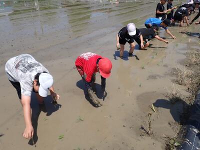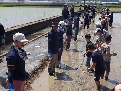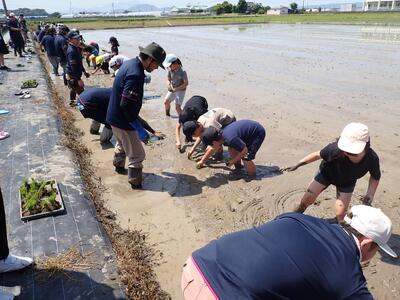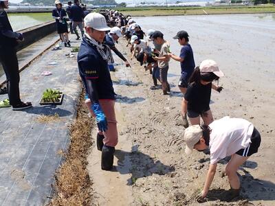 子供たちは、JAの青壮年部の方々のご指導のもと、稲を一株ずつ手植えしていきました。ぬかるんだ土に足を取られながらも丁寧に植えていました。