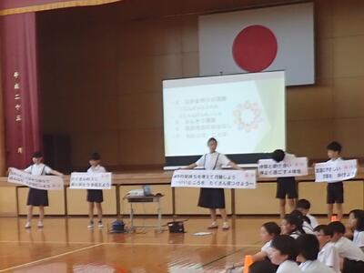 6月は「心の絆を深める月間」でした。この間、各学級で道徳や学級活動の時間に人権問題学習に取り組みました。会では、そこで学んだことをもとに作成した人権宣言文の発表や、仲間意識の向上を目指したゲーム(人間知恵の輪、じゃんけん列車)などがありました。