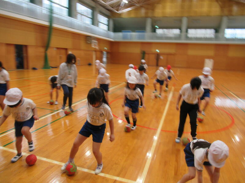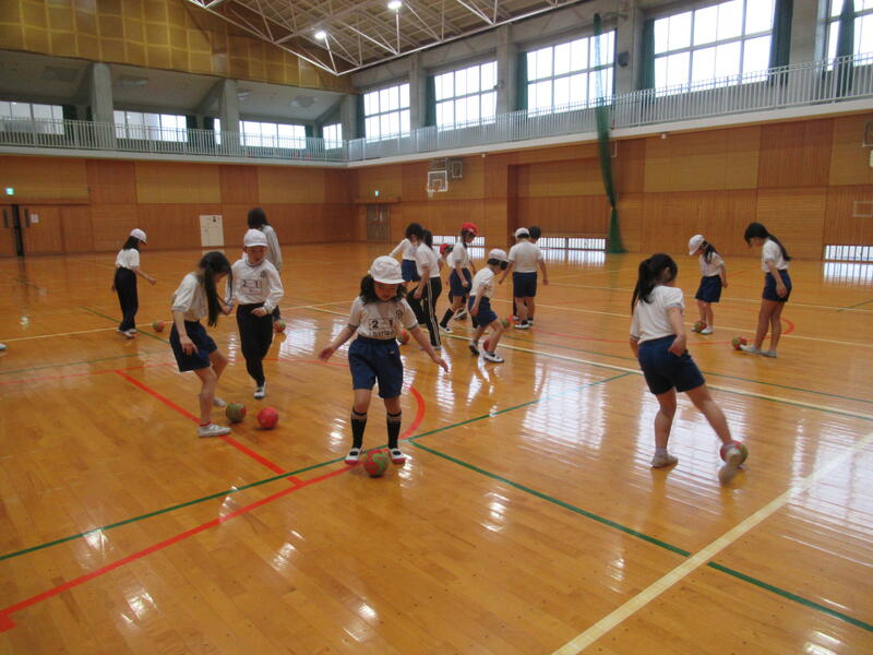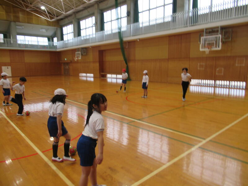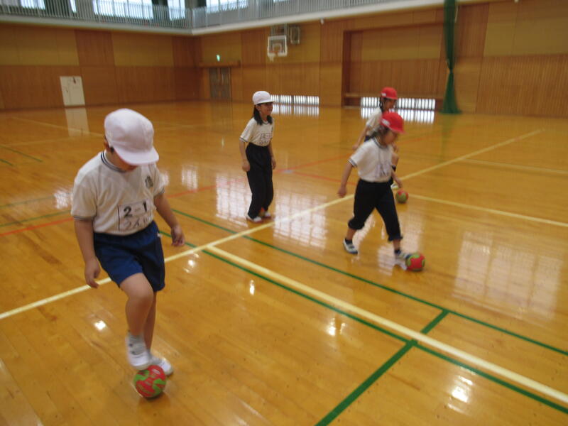 最初の授業でゲームをしてみました。すると子供たちから、①ボールを蹴る力(パス)、②ボールを止める力(トラップ)、③ボールを運ぶ力(ドリブル)が必要であることが出されました。この3つの力を向上させるために練習中です!!
