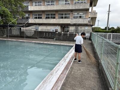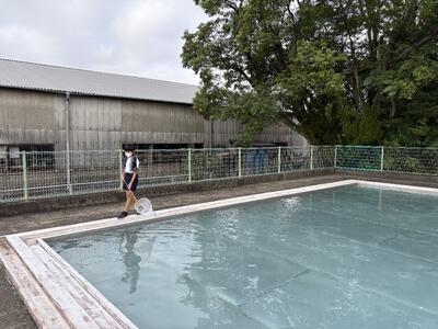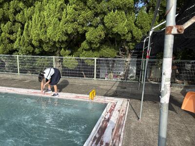 落ち葉拾いや溝の掃除、プール周りの草抜きなど、自分たちでやるべきことを探して掃除に取り組んでいます。この子供たちのおかげで、みんながきれいなプールを使うことができています!