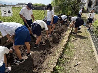 次はブロッコリーを育てます!畝作りから取り組み、マルチを張り、苗を植えるまで協力して行うことができました。今後も成長の様子を観察し、大切に育てていきたいと思います!