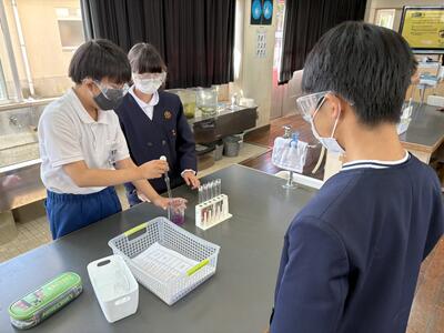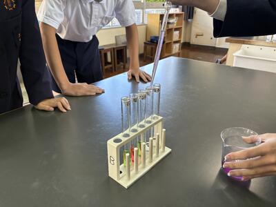 先日行った、ムラサキキャベツ液を使った実験では、液体の変化による性質の違いを調べました!安全に注意して実験を頑張っています!