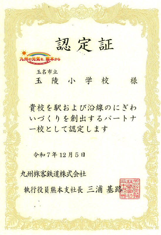 12月5日、新玉名駅において「にぎわいづくりパートナーシップ認定式」が行われました。これは、駅や沿線のにぎわいづくりを創出するパートナー校として、小学校、中学校が認定されました。これからも、学校運営協議会や地域の皆様とともに、新玉名駅や沿線界隈の元気づくりに貢献していきたいと思います。