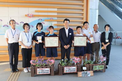 6月14日、玉陵小中学校学校運営協議会が、環境大臣表彰「地域環境美化功労者表彰」を受賞しました。地域住民と連携して、駅や病院に花を提供し、花壇の世話、除草作業、周辺の清掃活動を行う「おもてなしフラワープロジェクト」を14年間継続的に実施していることが、高く評価されての受賞です。