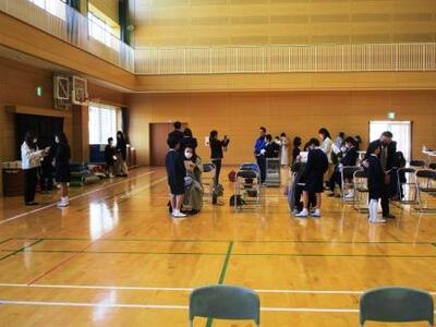 5年生は、体育館で「音楽」の授業を行っていました。リコーダーを吹くということで、飛沫を飛ばさないようにと先生が考えてされていました。