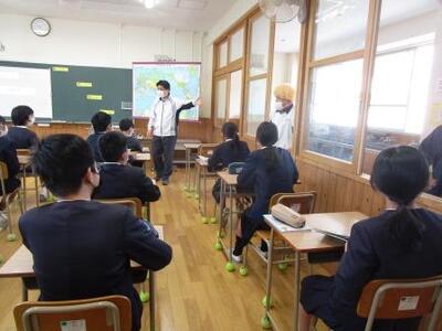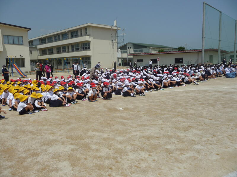 授業中に地震が発生したことを想定し、避難訓練を行いました。小中合同で行い、児童・生徒が一斉に小学校の運動場に避難しました。その後、担当の先生や中学校の校長先生から、津波の怖さや、避難する時の大事なポイントについて話がありました。