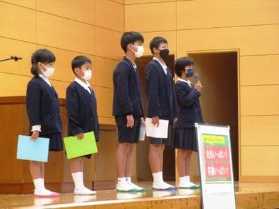 6年生は卒業までのボランティアの一環で、担当委員会以外の人も毎朝交替であいさつ運動に立ってくれています。来年は君たちも中学校でピンシャツデーに参加しているのですね!