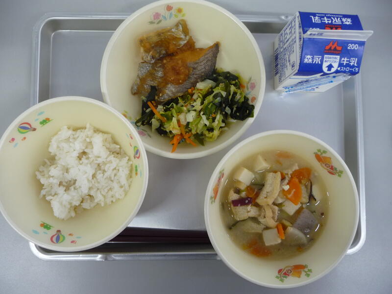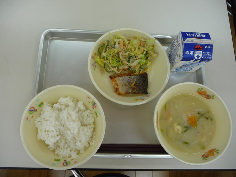 ※給食のメニュー・・・麦ごはん、根菜スープ、ホキのみそマヨ焼き、サラたまあえ、牛乳