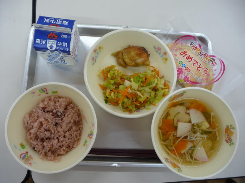 今日の給食は中学生の卒業お祝いメニューでした。明日もお天気に恵まれるようです。お弁当、お世話になります