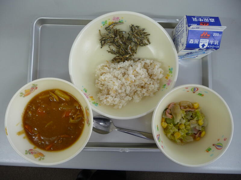 【今日の給食】むぎごはん、春野菜のカレー、いりこ酢炊き、ヨーグルト和え、牛乳