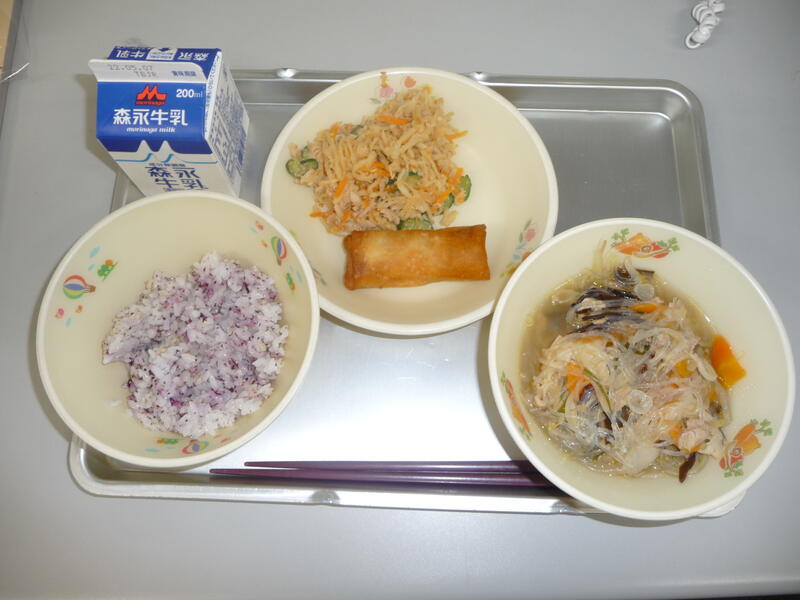 ※ 今日の給食メニュー・・・キムタクごはん、春雨スープ、焼きぎょうざ、キャベツの中華サラダ、牛乳