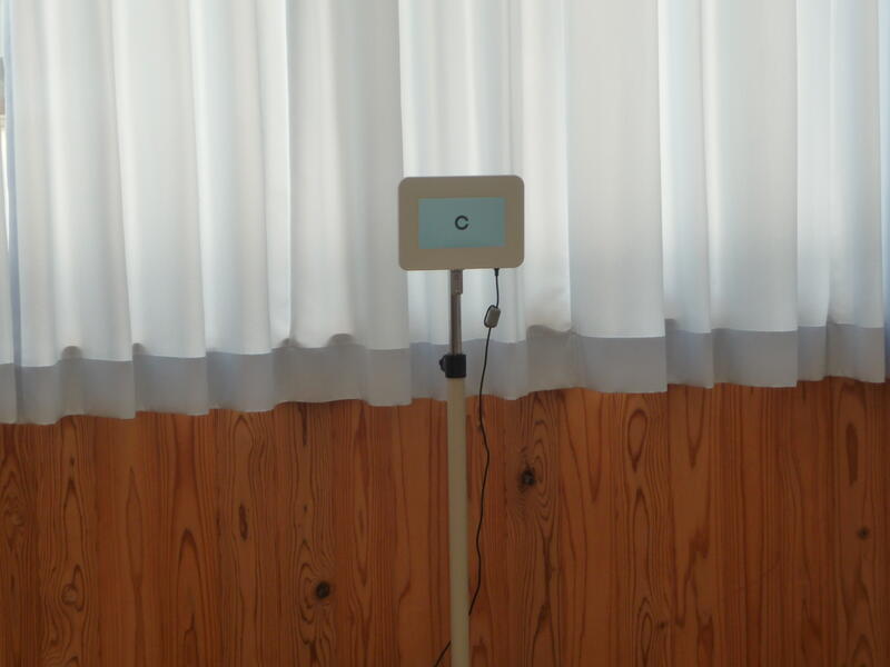 先生が児童のすぐ横で、ワイヤレスリモコンを操作すると、先にあるモニターに「C」が表示されます。児童がそれを見て、どこが開いているか指か口頭で答えるようになっています。