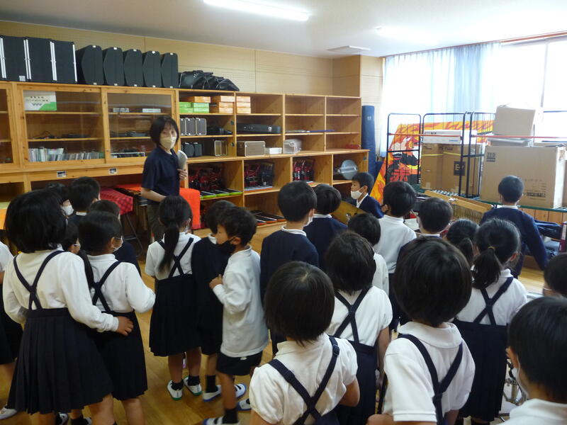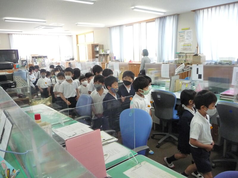 いわゆる「学校探検」です。校舎内にはどのような部屋があって、だれが、どんな使い方をしているか歩いて見て回る学習(生活科)です。1年生は、どの部屋も興味深く見ていました。