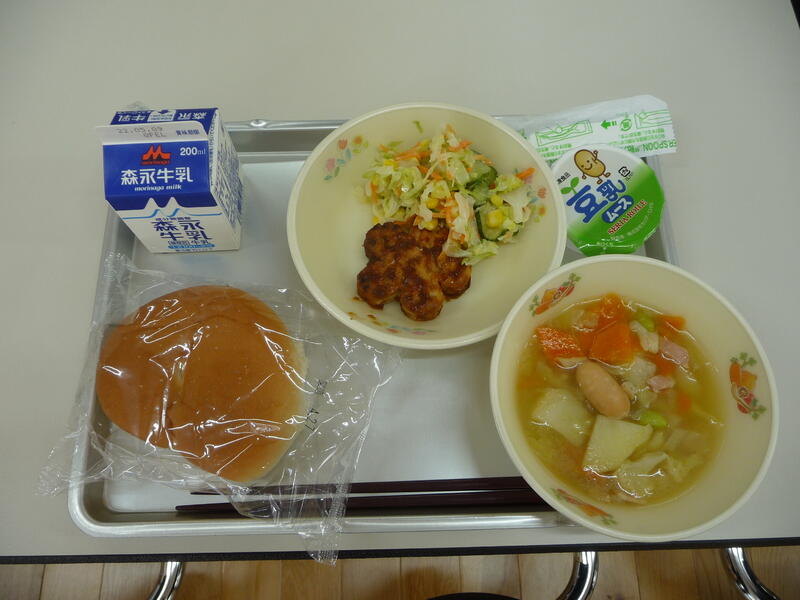 【今日の給食メニュー・・・丸パン、野菜スープ、花型豆腐ハンバーグ、コールスローサラダ、豆乳ムース、牛乳】