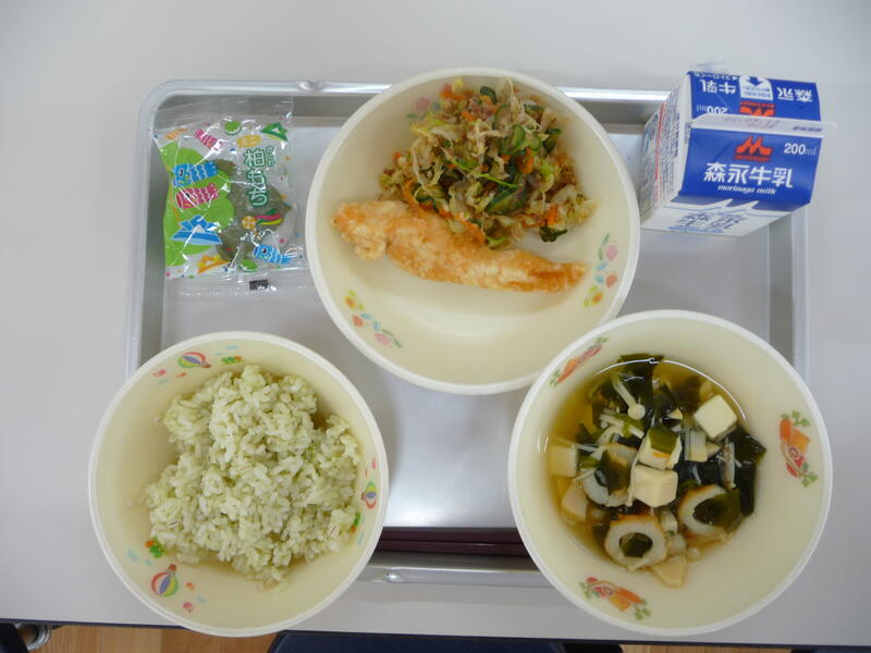 【今日の給食・・・若竹汁、ささみレモン付け、かつおあえ、かしわ餅、茶飯、牛乳】