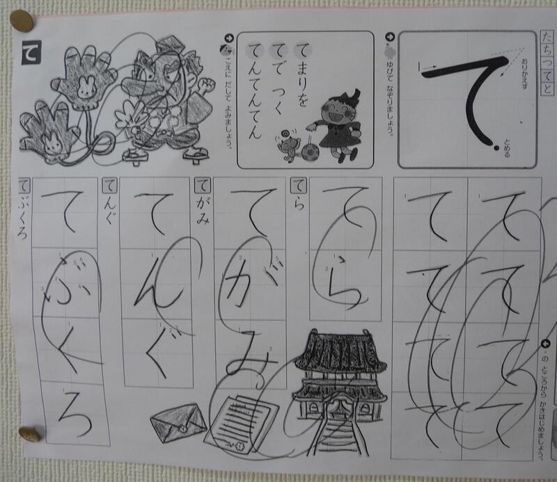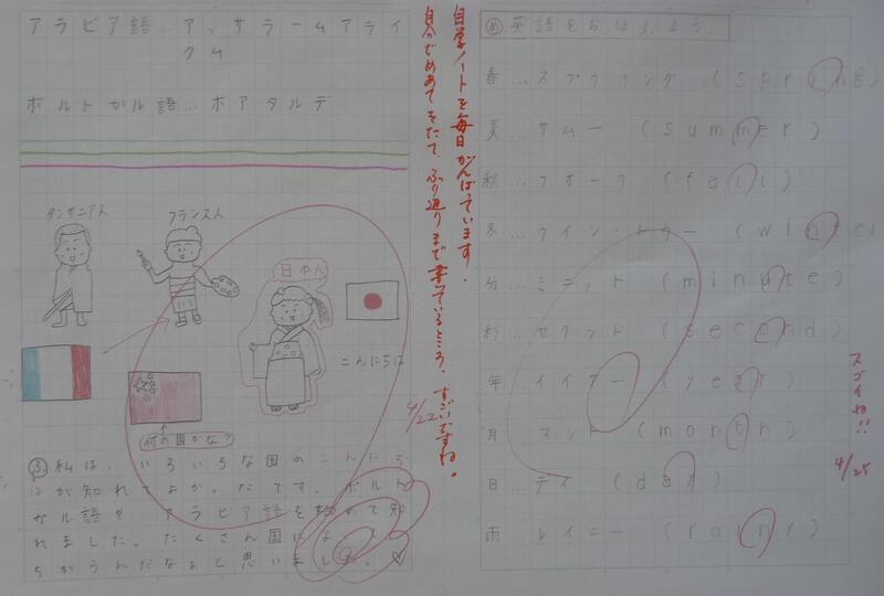 1年生は、算数の時間に数の合成について勉強をしていました。ノートのとおり、6は4と〇からできている、また、6は3と3からできているなどです。指を使ったり、頭をひねったりしながら頑張っていました。