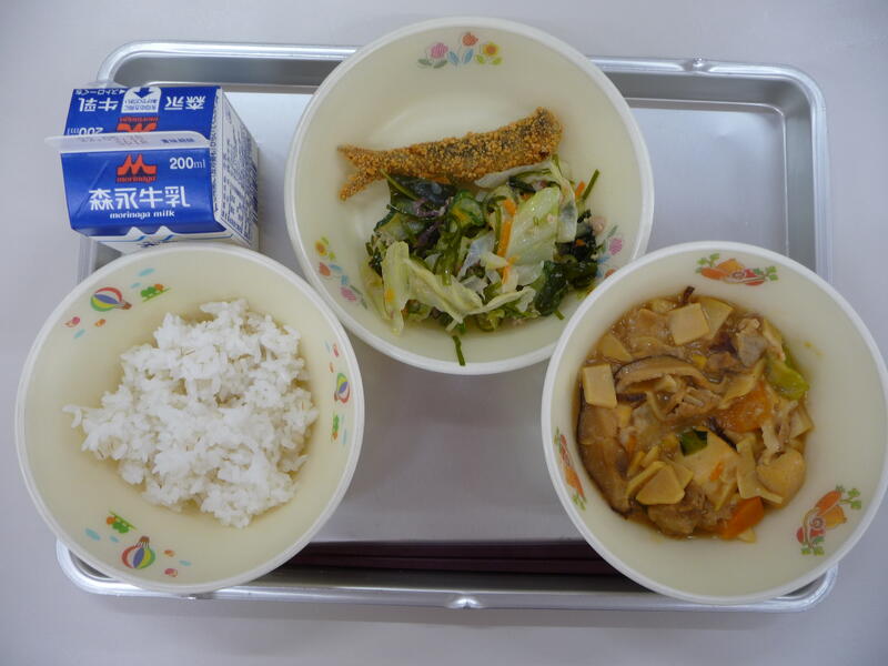 ※今日の給食メニュー・・・麦ごはん、家常豆腐、いわしのカリカリあげ、海藻サラダ、牛乳