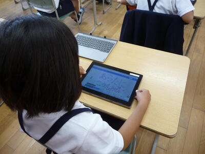 2年生は、タブレットのディスプレイに指で文字や絵を描いたり、イラストを挿入したりして練習していました。ICT支援員さんにもアドバイスをもらいながら、楽しく活動をしていました。校長先生を見つけた児童が、練習を兼ねて、名前を書いてくれました。