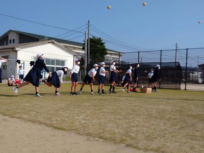 朝活動の前に、5年生が運動場の隅でソフトボールを投げる練習をしていました。体力テストに向けて、あまりボールを投げる機会のない子どもたちに、担任の先生が投げ方を伝授されていました。きっといい結果につながるでしょう。