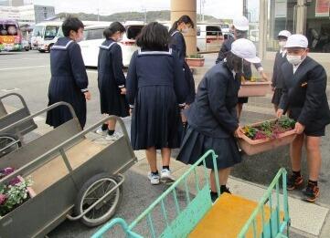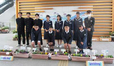 昨年度から始まった地域貢献の一環、「おもてなしフラワープロジェクト」。今年も新玉名駅へ中学生と一緒に植え付け育てたプランターをお届けしました。