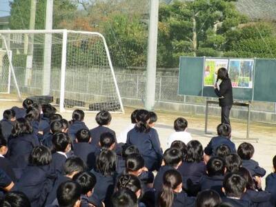 今日の全校朝会では新しく中学校に赴任されたALTの先生の紹介と、これまでの表彰を行いました。