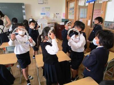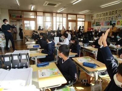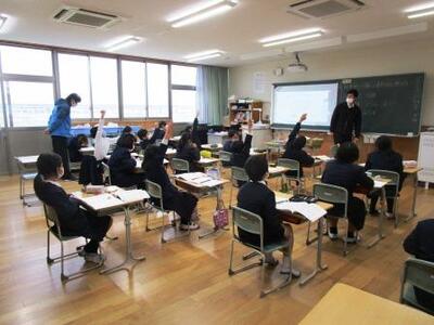4の2では理科の授業。理科室での対面を避け教室で授業が行われています。3年以上の学力検査は理科、社会もあります。学習内容の定着をがんばっています。