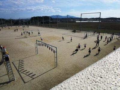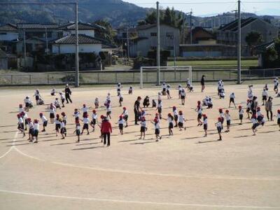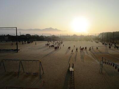 走る!走る!子供達。体育主任は、どんなに冷え込んでも毎朝半袖でライン引き後、高学年と一緒に走ります。すごい!