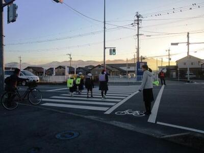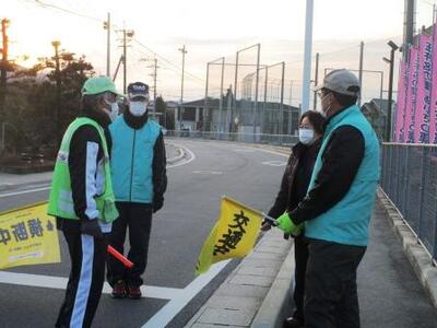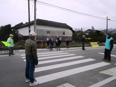いつもの元気班。遠くからの「おはようございまーす!」に見守り隊の皆さんも「おっ来た来た!」と喜ばれます。