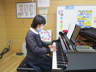 音楽室の壁面には各学年の良い振り返りが掲示してあります。所長が感心して見入っておられました。