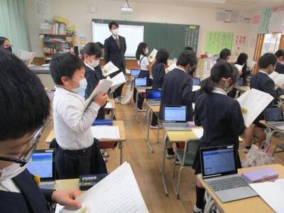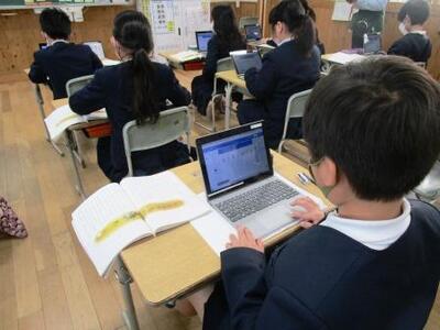 4年生。タブレットを使って天草地方の地域の学習をしています。