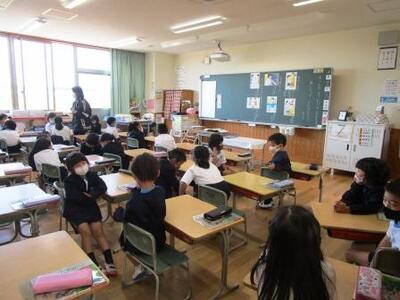 3年2組では実習生の松尾先生による外国語活動の授業「What do you like?」テンポがあって楽しく英語に親しみました