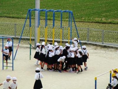 お弁当後、運動場では解団式。「みんなの協力があって優勝できました。」