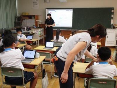 6年生は、教室で先生が授業を行い、子供達は2教室に分かれてオンライン上で授業を受ける練習をしました。