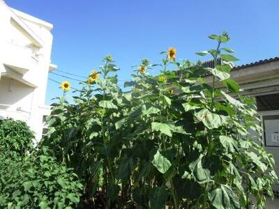 今年のひまわりは高く高く伸びています。夏空の下、花が咲き始めました。