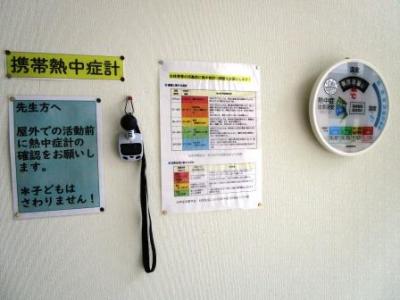 熱中症計のWBGTの値が28を超えたら、外での激しい運動は中止します。この他、学校の熱中症予防対策については、明日のPTA役員会でお諮りした後、来週お知らせを配付する予定です。