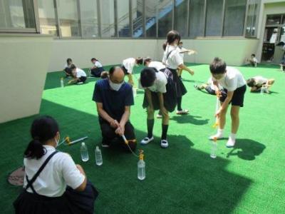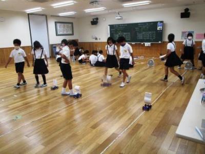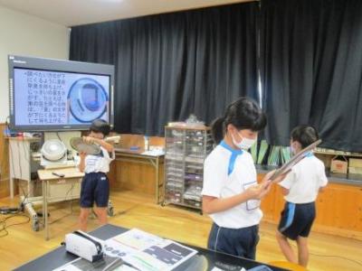 3年生理科「ゴムや風の力」。班ごとにサーキュレーターの風力を変えたり風受けの大きさを変えたりして車が走る距離をメジャーで測っていました。