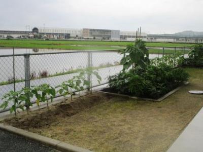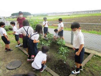 2年生が学級花壇に植えたピーマンが続々と実をつけ、喜んで収穫していました。