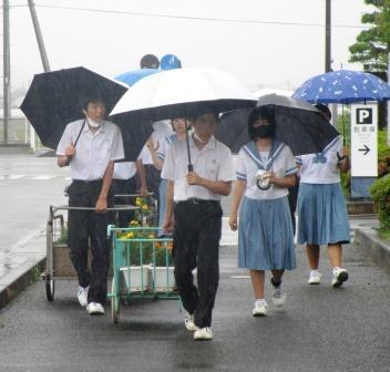 雨の中、プランターをのせたリヤカーを引いて…