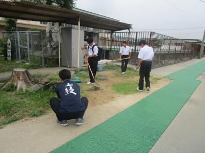 児童下校後は、強い日差しの中に男子部の先生方を中心に運動場のライン引きが行われていました。