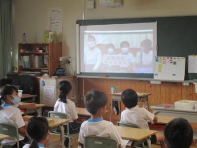 音楽室では映像を見ながら鍵盤ハーモニカの運指の練習