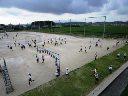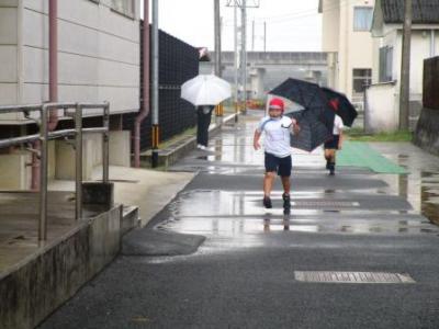毎朝の先生方の運動場整備が終わり、金栗タイム開始と同時に今朝は雨がポツポツと…体育主任の「全速力で1周!」の声で、遊びながら開始を待っていた子供達がワーッ!と1周走って校舎へと入っていきました。それでも満足そうでした