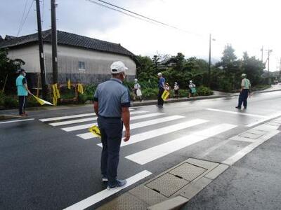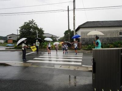 一番の元気班。雨に負けない元気なあいさつ!