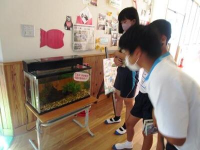 生活科室から逃がすことに(右下の床の上)…見守る1年生が「きっと学校が好きなんだね。」一言に和みました